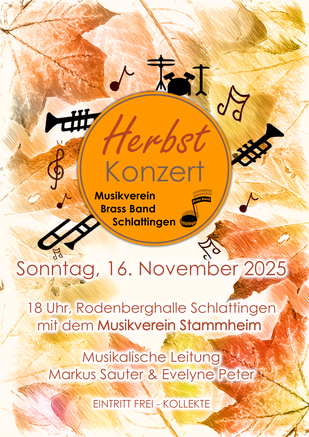 Der Musikverein Brass Band Schlattingen wurde 1920 gegründet. Die Brass-Band-Formation bringt fetzige Musik ins kleine Dorf am Rande des Kantons Thurgau. Mit einem abwechslungsreichen Repertoir von Marsch, Rock, Polka, Pop, Gospel bis zur Filmmusik kommt jeder Zuhörer auf seine Kosten. Durch die zahlreichen Ständli und Konzerte versuchen wir das Dorfleben in der Gemeinde Basadingen-Schlattingen aktiv mitzugestalten und den Einwohnern immer wieder eine Freude zu bereiten. Wir proben jeweils am Donnerstag von 20.10 bis 22.00 Uhr in der Gmeindschüür Schlattingen (Zusatzproben: Montag 20.10 bis 22.00 Uhr). Neben der Probe-Arbeit wird aber auch die Pflege der Kameradschaft nicht vergessen. Gemütliche Runden nach der Probe gehören ebenso dazu, wie spezielle nicht musikalische Anlässe. Es würde uns sehr freuen, Sie an einem unserer nächsten Auftritte begrüssen zu dürfen!